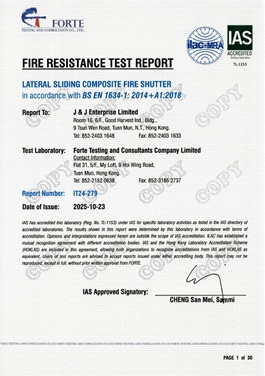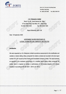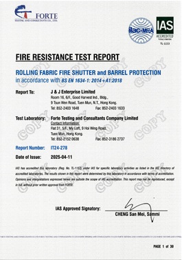 本公司已取得由認可測試中心發出的 BS EN 1634 防火隔熱捲閘合格證書,合資格生產防火隔熱的直閘、橫閘及電梯閘,防火隔熱效力可達 FRR -/240/150。